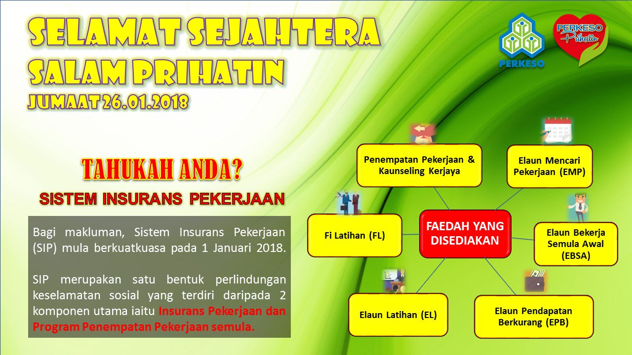 Twitter 上的 Perkeso Official Makluman Sistem Insurans Pekerjaan Sip Berkuatkuasa Mulai Hari Ini 01 Januari 2018 Perkesoprihatin Perkesomemayungianda Sip Ksm Negaraku Https T Co Bm6n8kqteu Twitter